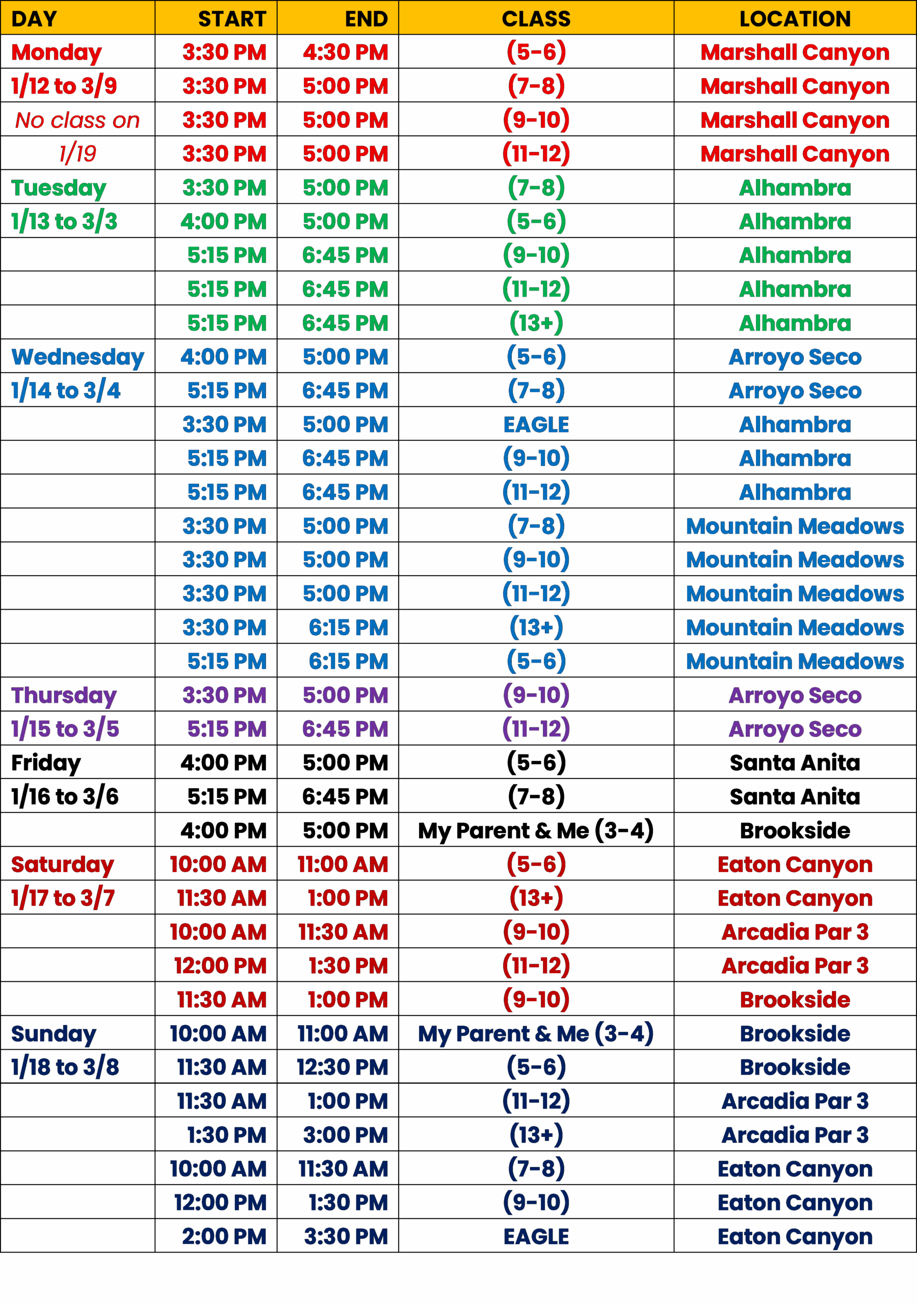 The 2026 Winter Session will start the week of Monday, January 12th, through Sunday, January 18th, and will run for 8 consecutive weeks. There will be no class on Monday, January 19th due to the holiday. This class will be made-up on Monday, March 9th.
